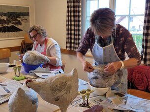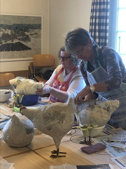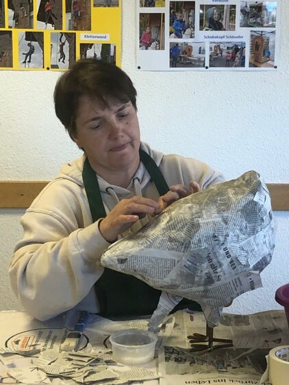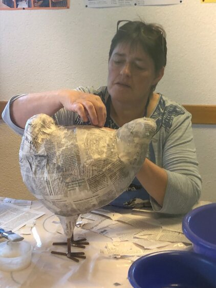 Schritt für Schritt formten wir aus einem Ballon, Zeitungen und Kleister ein lustiges Federvieh.